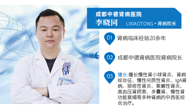 李晓同,成都中德肾病医院肾病院长,毕业于河北大学医学院,从事肾脏病临床工作近二十年,积累了丰富的临床经验,对肾脏病的诊断和中西医结合治疗有独特见解。擅长运用中西医结合方法诊治慢性肾脏病,如急慢性肾小球肾炎、肾病综合征、IGA肾病、高血压肾病、糖尿病肾病、紫癜性肾炎、狼疮性肾炎、痛风肾及急慢性肾衰竭以及尿毒症维持血液透析阶段并发症的治疗。李晓同院长指出,临床实践证明,采用中西医结合方法治疗肾病可提高疗效,达到恢复肾脏功能的目的。